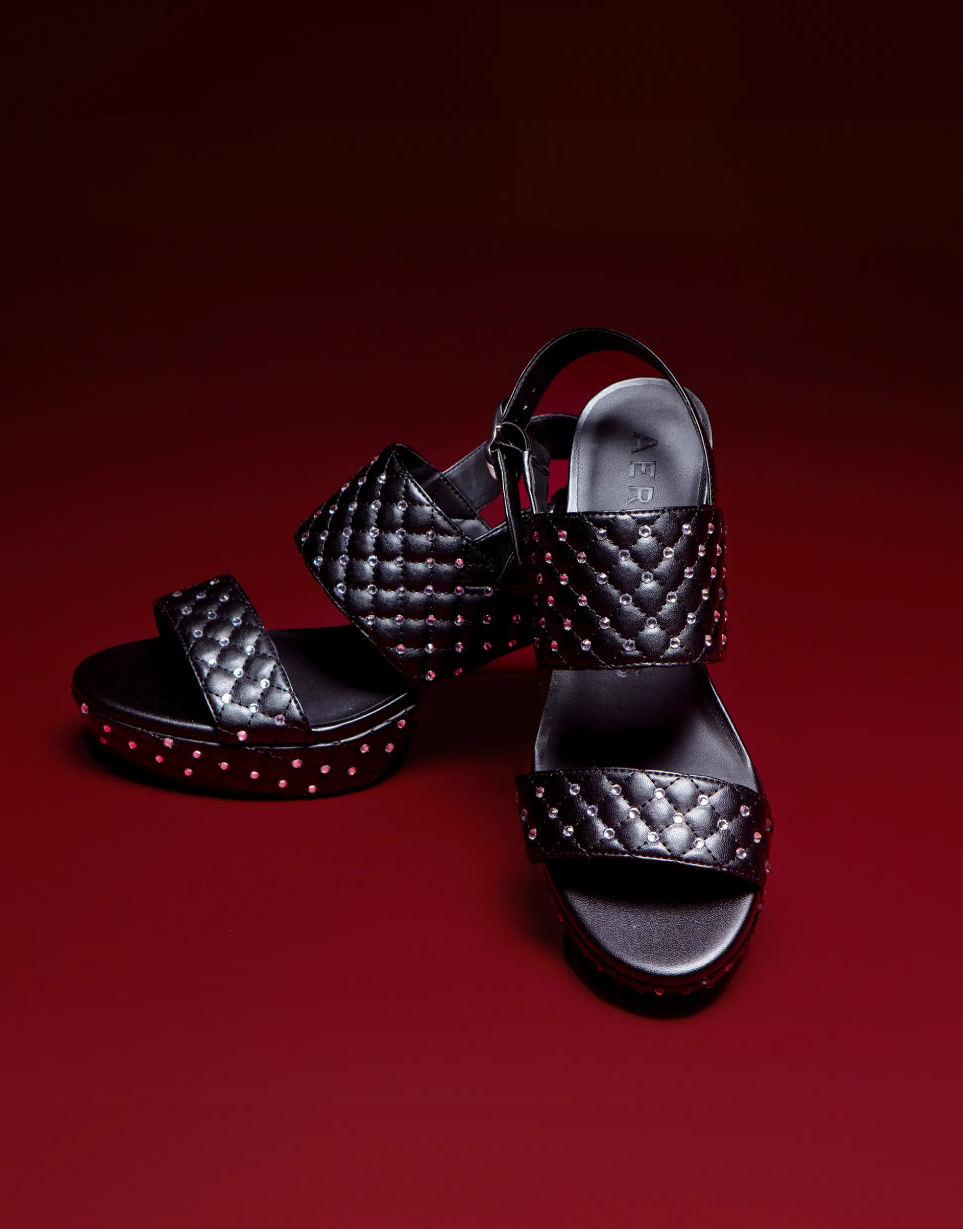 Camera Women's Platform Sandal Details: Color: Black Quilted Faux Leather With Crystals Material: Faux Leather Heel Height: 3 Heel Type: platform Platform Height: 1.25 Closure Detail: None Toe Shape: Square Camera Women's Platform Sandal Features: Designed for Comfort diamond flex outsole ortholite foam insole Ideal