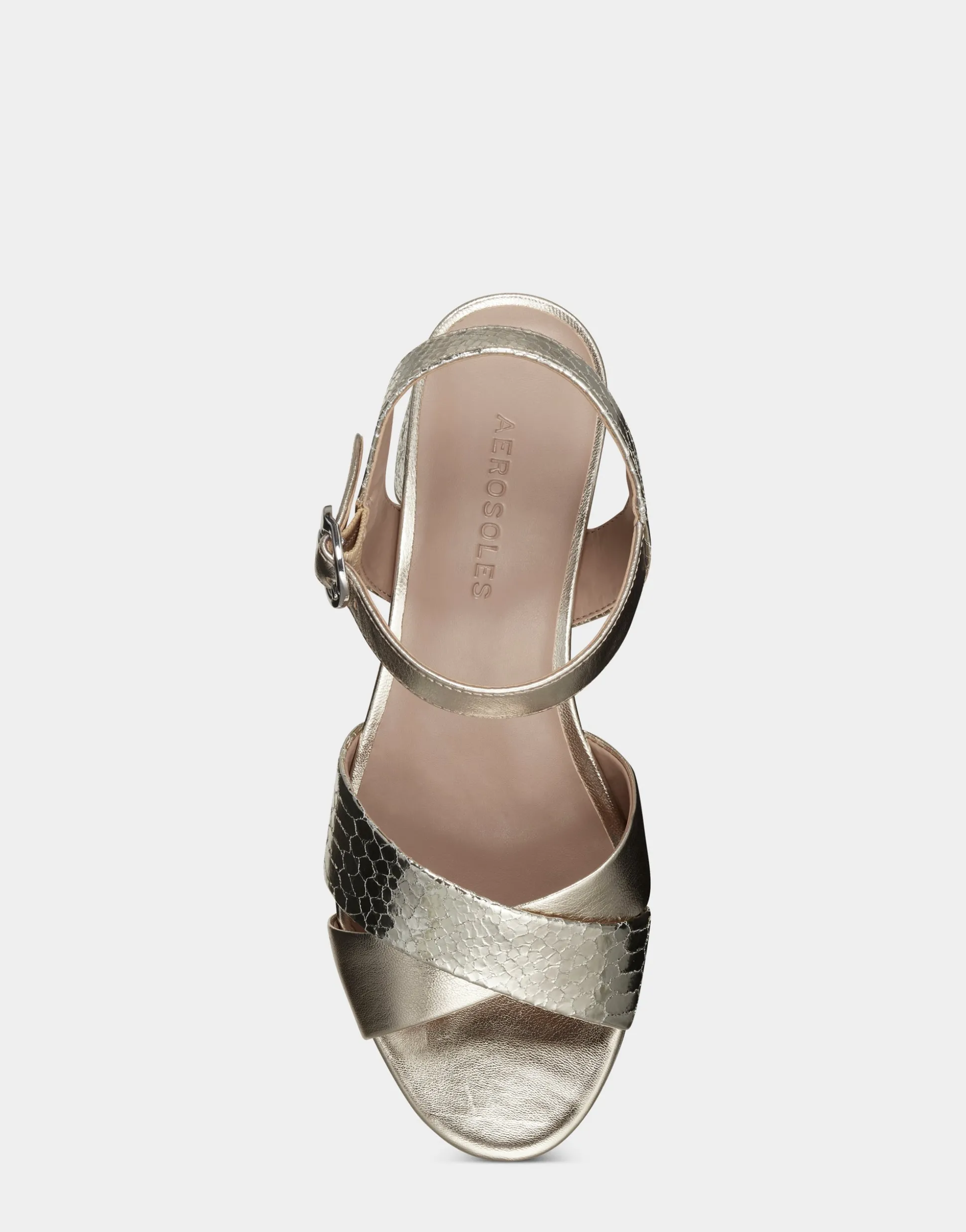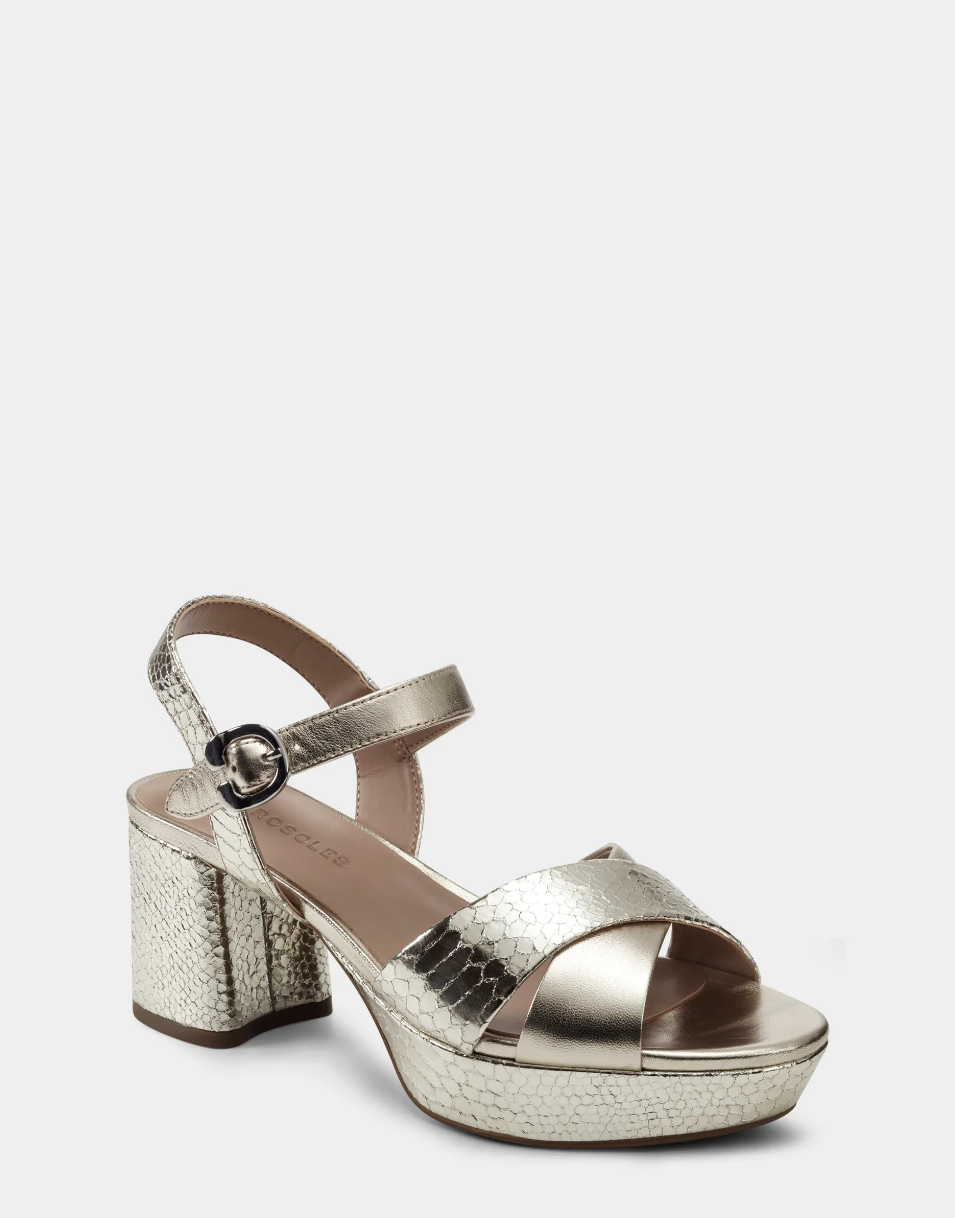 Platform sandal with a modern elegance, chunky yet lightweight – the Cosmos features a block heel, crossover straps that frame the foot, and an ankle strap with a polished signature buckle. Crafted with soft gold leather and python embossed mirror metallic leather, they are the epitome of easy elegance and will instant
